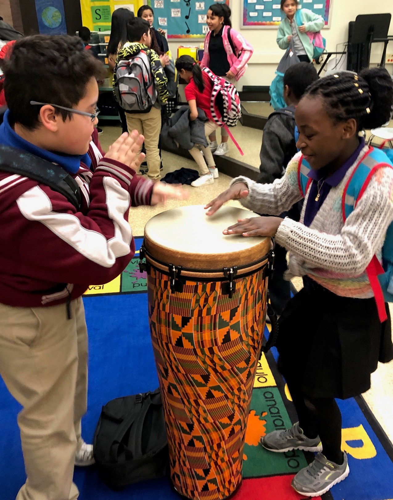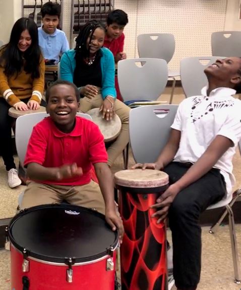 “Every country has some sort of drumming, and each student, no matter what language they speak, can learn to play a rhythmic pattern together and to keep a beat together,” said Kristin. “Beyond that, students will learn methods to relieve stress and to express their