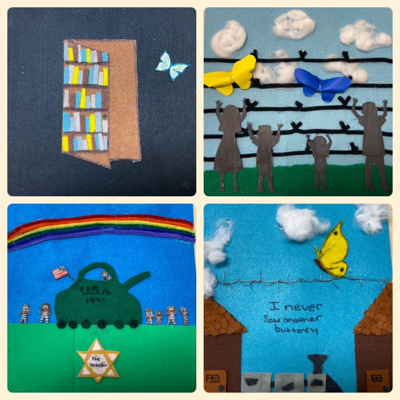 This year as a capstone to the unit, our students took part in a project which memorialized the victims and survivors of the Holocaust by creating a memorial quilt. Our local Holocaust museum is to credit for the idea behind the project as it is one they have done with visiting classrooms and have displayed in their learning center. Our students had the opportunity to visit the museum, hear from a survivor, view the quilt designed by past students, as well as take a guided tour of the museum. This visit created many questions for them which we explored during our unit. At the end of the unit they each created a felt quilt square. Each individual also wrote an accompanying essay explaining the symbolism present in their quilt square. The pieces were then combined to make one large class quilt as a memorial to the lives lost in the Holocaust and display in the school as a way to remember the lessons that can be learned from this tragedy.