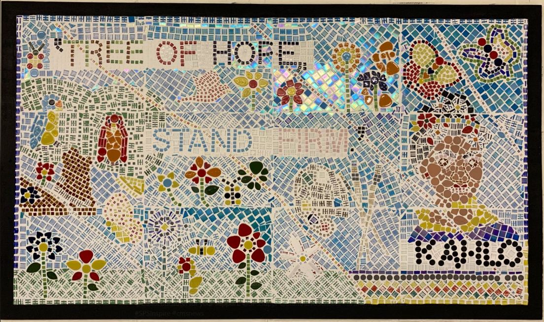 A group photo of students who created each mosaic is mounted alongside their artworks, which were praised by the mayor and the superintendent during a special showing.