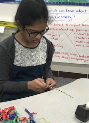 Our lobby was also the location for our one-of-a-kind bracelets. Each bracelet had a hand-stamped message (like HOPE or JOURNEY or our school mascot, PATRIOTS) and hand-tied strings. Students worked during lunch periods to create them and then asked for donations and talked with guests about the mission of BikeyGees and what is being done to assist refugees and asylees in other parts of the world.