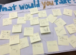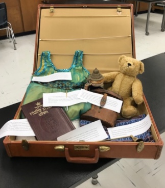 Things were a little quieter in our focus rooms. Students spent weeks reading, discussing and organizing their work based on a character in the novel Refugee. Here are some scenes from Josef’s room (Nazi Germany, 1939). A poster asked “What’s in the family’s suitcase?” and the packed items chosen by students were labeled with detailed notes about a party dress that Josef’s mother might have worn, a Torah that Josef needed for his Bar Mitzvah, a stuffed bear for Josef’s little sister, Ruth, and a shawl for covering heads and shoulders for religious activities. Students practiced research and writing as they worked together on this, then guided guests in Josef’s journey. Staying in the heart of Kazimierz and visiting Auschwitz- Birkenau allowed us to discuss some of the connected historical events. Next to the suitcase, visitors use Post-its to write something they would take if they suddenly had to leave home.