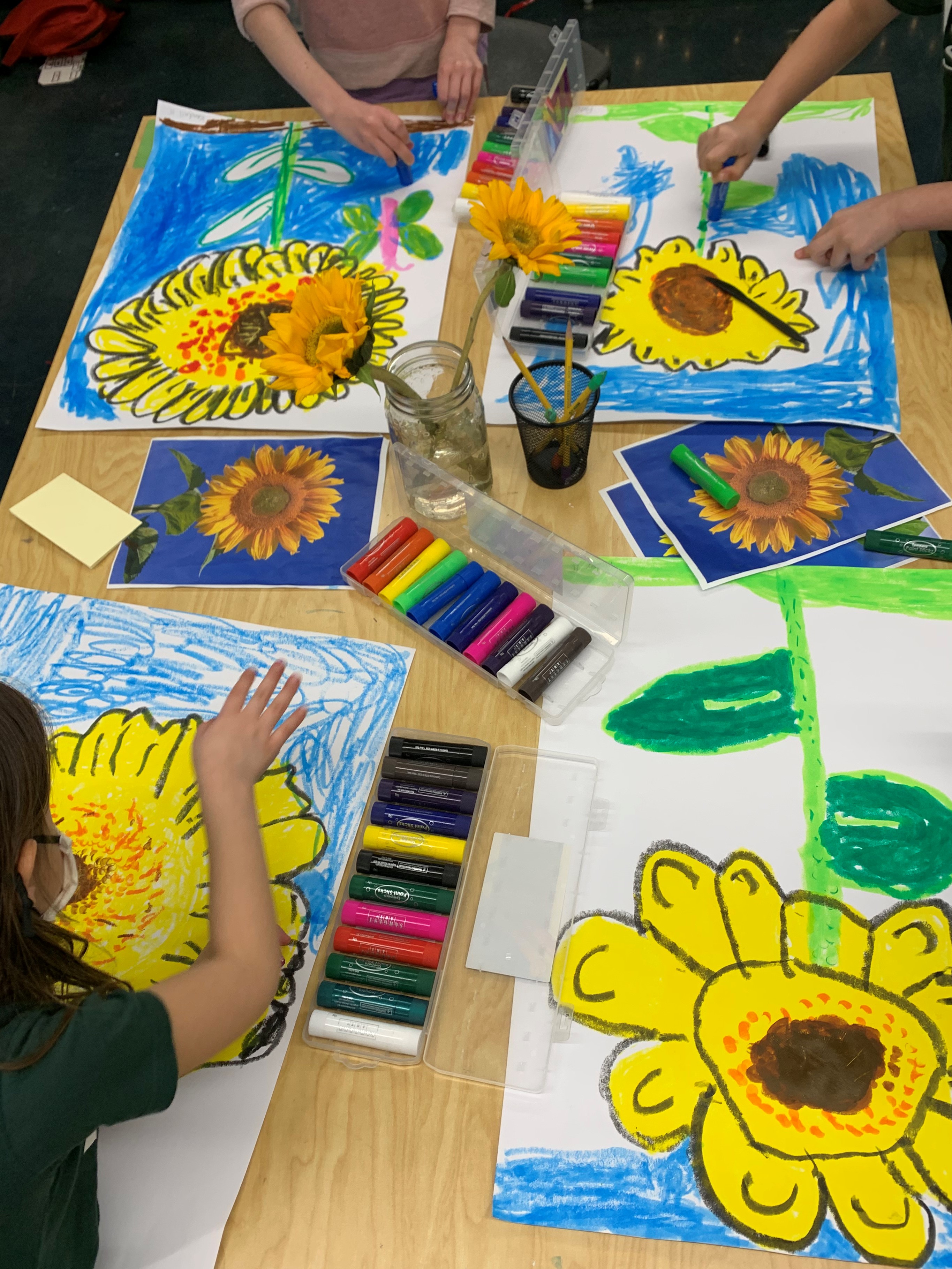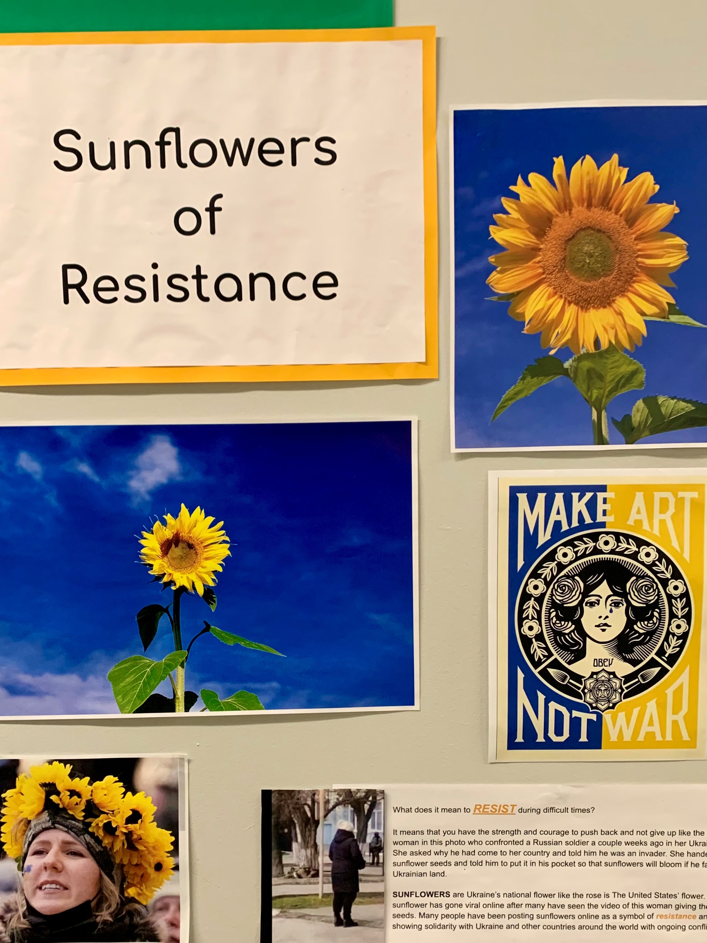 Over the past few weeks, my grade 1-3 classes have had these discussions in art class, most often initiated by them, that led to a couple initiatives at my school. One is a project I’ve titled Sunflowers of Resistance after learning that not only is the sunflower Ukraine’s national flower, but in recent weeks became a symbol of resilience and resistance. All of our students, grades 1 -8, currently in visual arts created one.